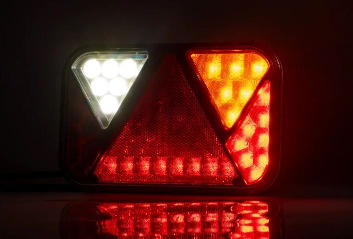 12 V. Mit sechs Funktionen: Dreieck, Bremslicht, Positionslicht, Blinker, Rückfahrlicht und Kennzeichenbeleuchtung. Mit LED-Systemsteuerung.